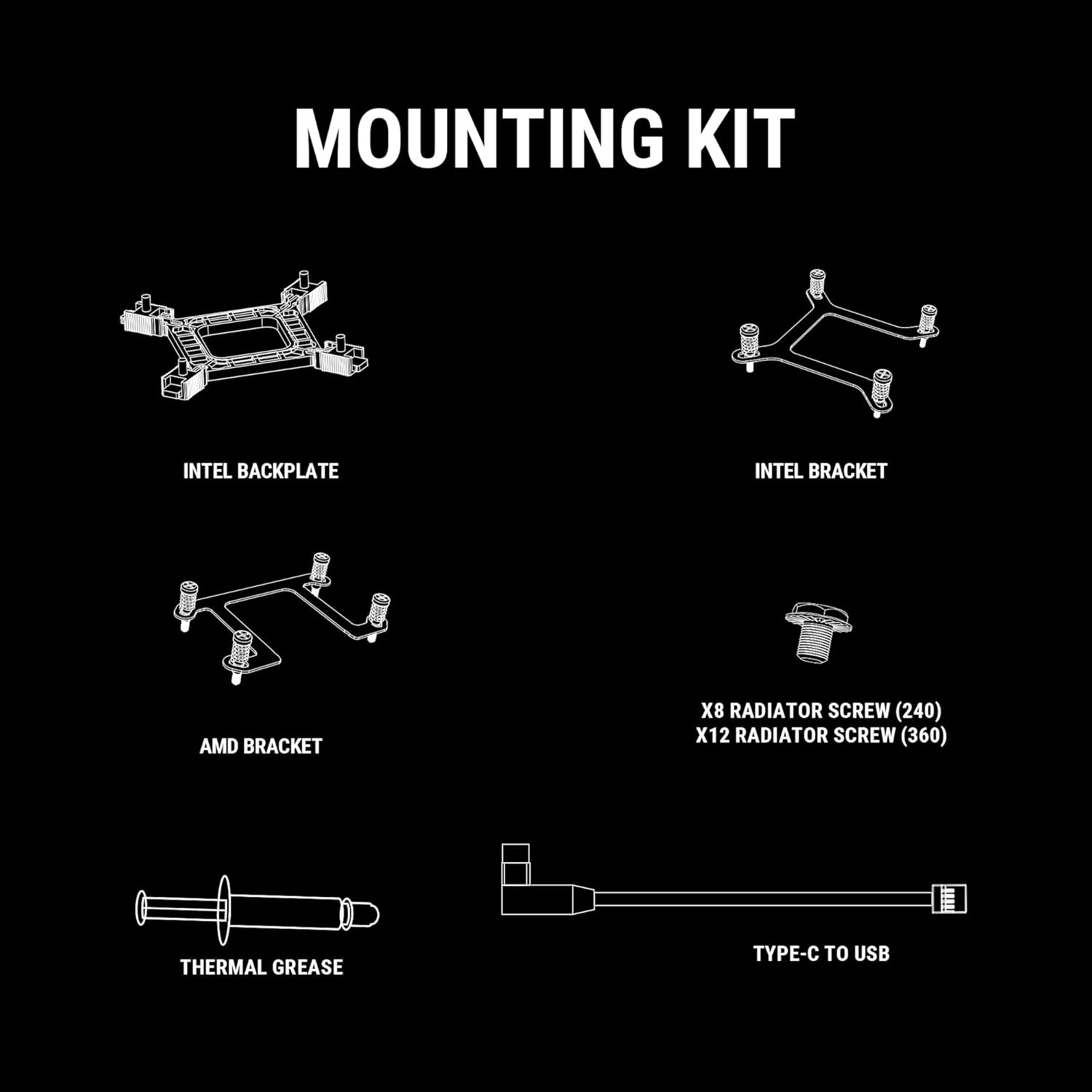 | Pump | Motor Type: Single-Phase Motor Dimensions (LxWxH):65.2 x 65.2 x 62.5 mm Voltage: DC 12V Starting Voltage: ≥DC 5V Rated Power: ≤4.2W Speed: 2600 RPM ±10% Noise: 27dB ±10% Operating Temperature: -10℃ ~ 60℃ Light: Addressable RGB LED Connector: ARGB 3-Pin 5V Male & Female, 12 Pin USB Internal Connectors Bearing Type: Ceramic |