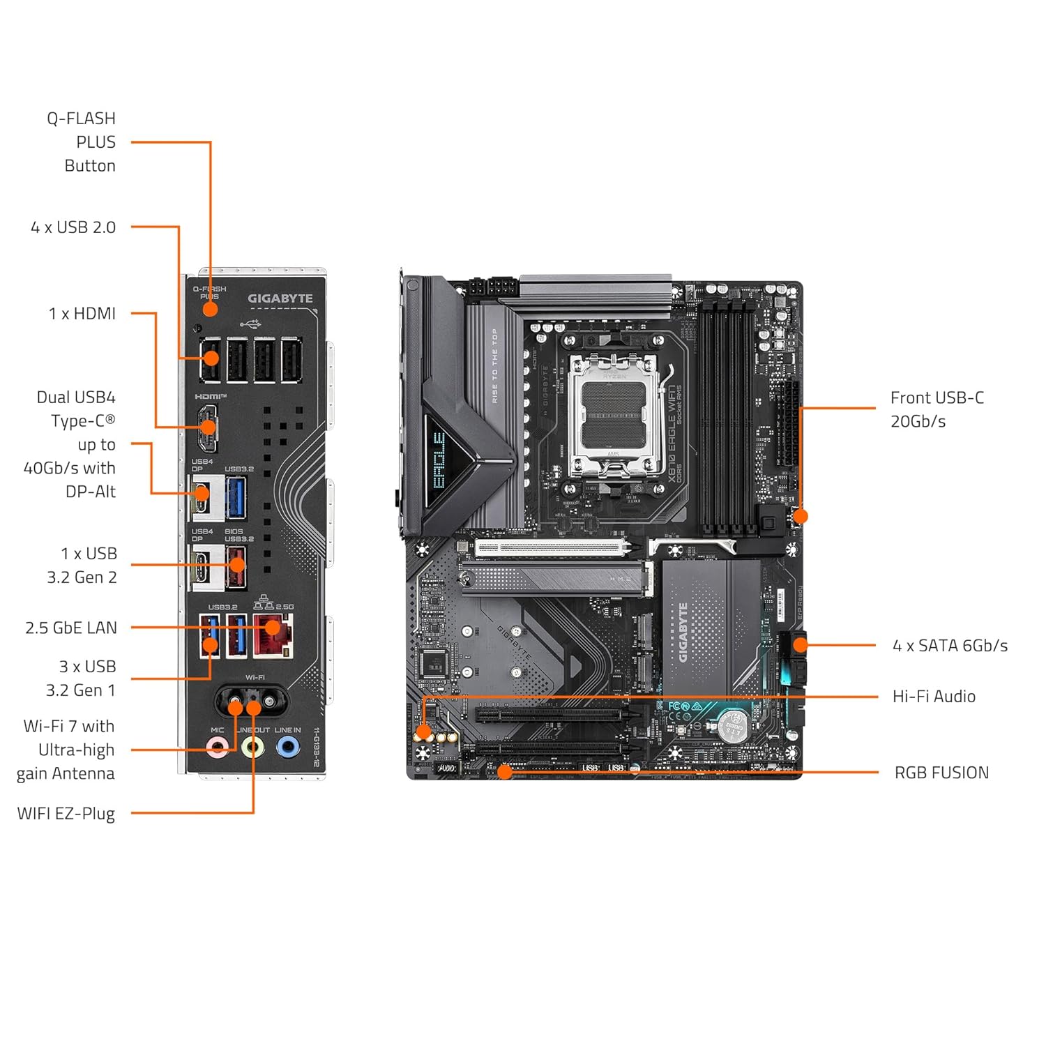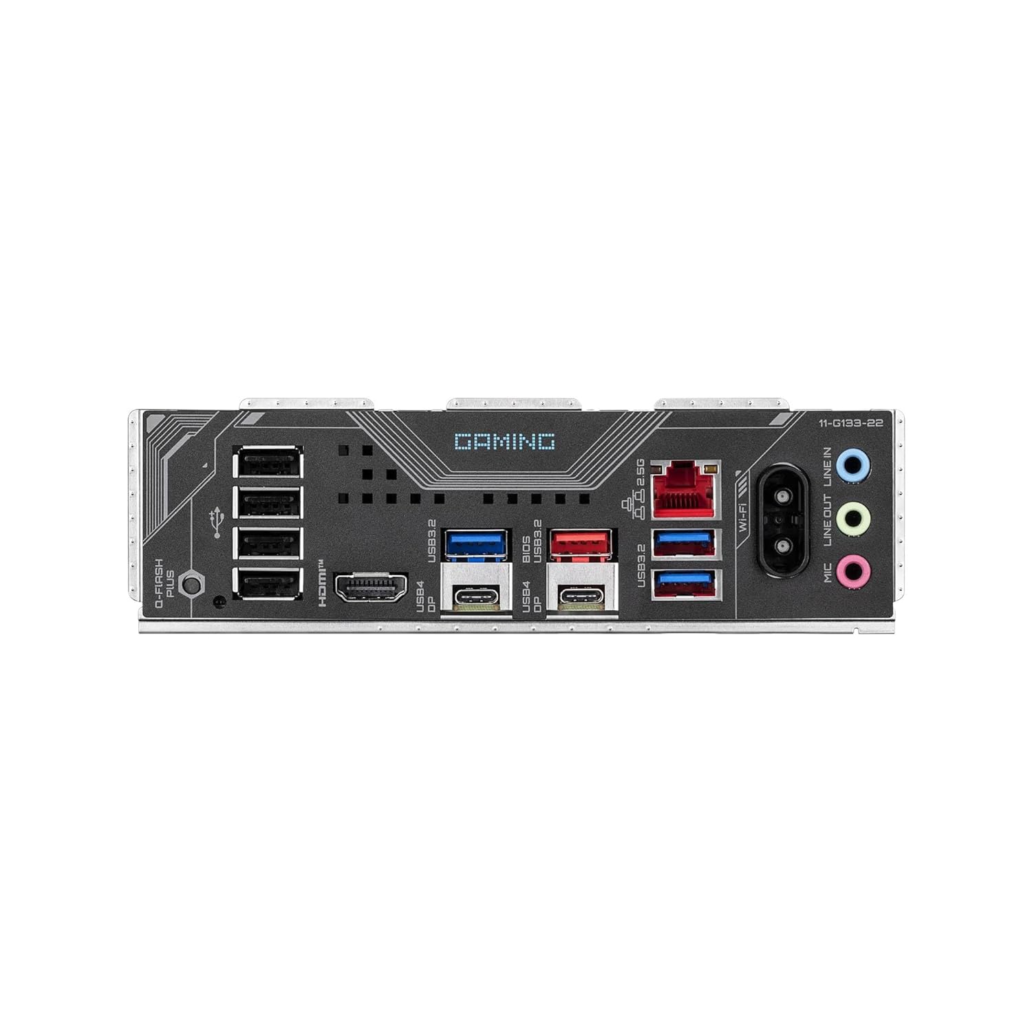 | Back Panel I/O Ports | 1 x Q-Flash Plus button 2 x SMA antenna connectors (2T2R) 1 x HDMI port (Note) 2 x USB4® USB Type-C® ports (DisplayPort (Note)) 1 x USB 3.2 Gen 2 Type-A port (red) 3 x USB 3.2 Gen 1 ports 4 x USB 2.0/1.1 ports 1 x RJ-45 port 3 x audio jacks |