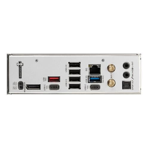 | Back Panel I/O Ports | Clear CMOS Button USB 10Gbps (Type-A) USB 2.0 5G LAN Wi-Fi / Bluetooth Audio connectors Flash BIOS Button DisplayPort USB 10Gbps (Type-C) USB 10Gbps (Type-C) USB 5Gbps (Type-A) S/PDIF-OUT |
